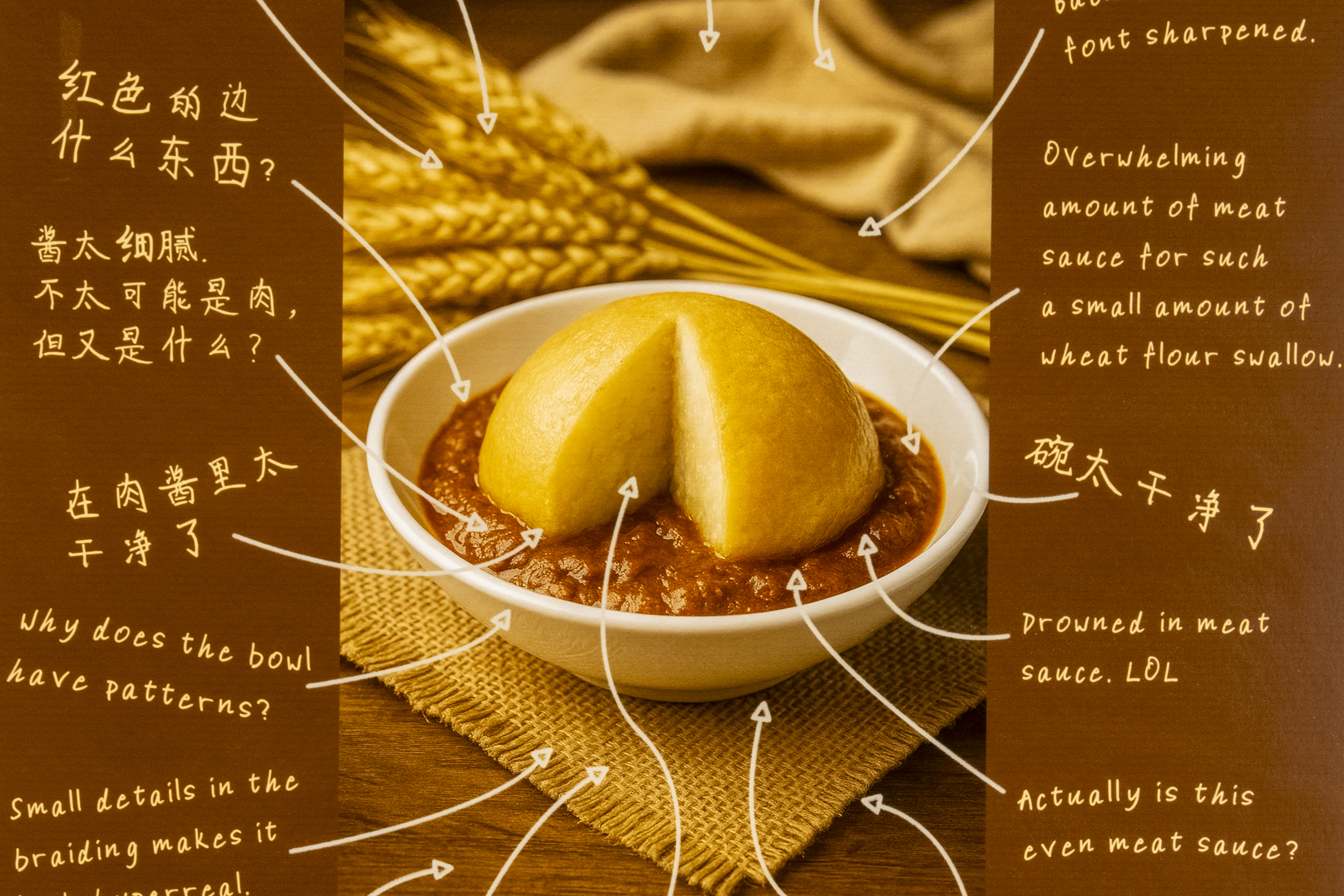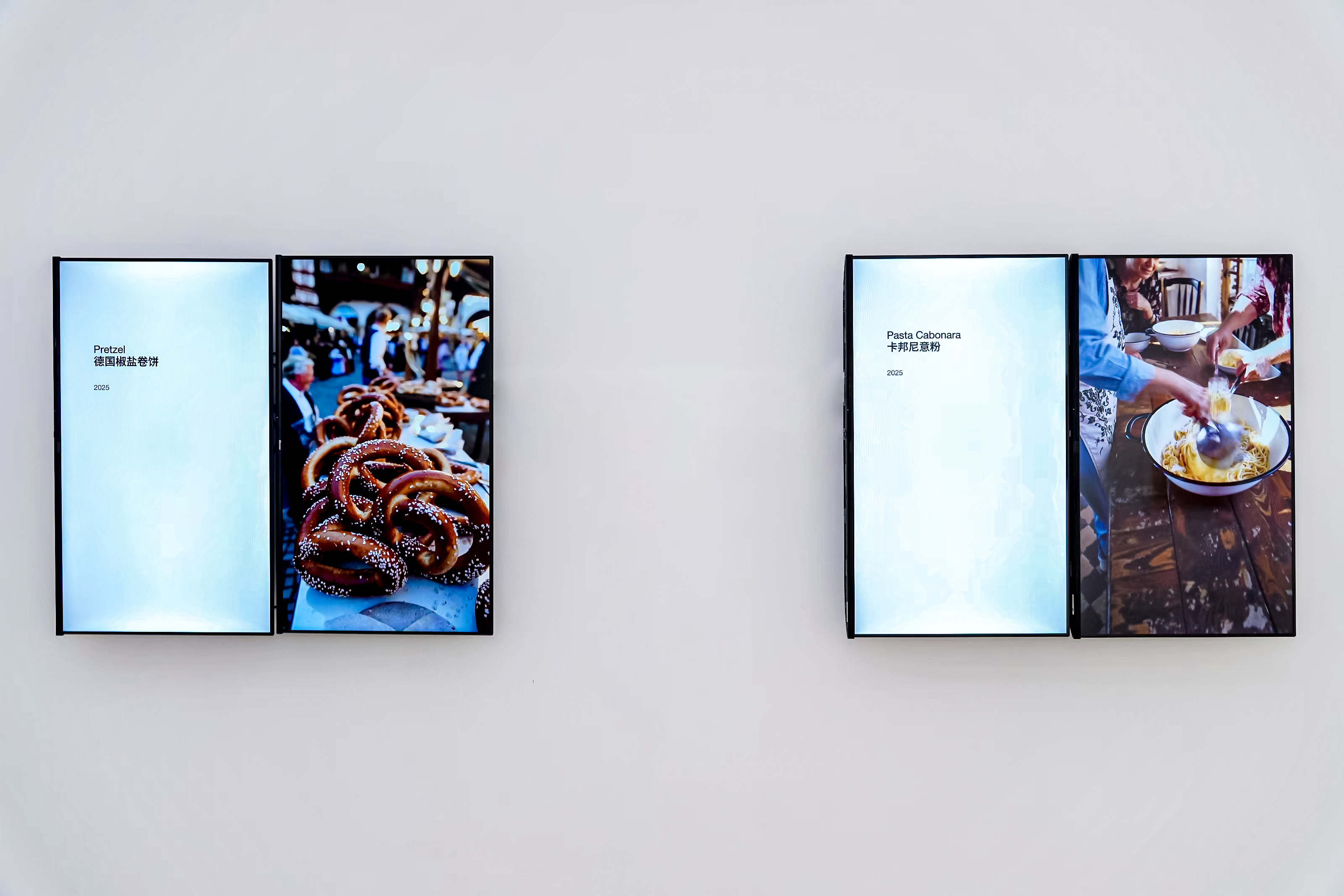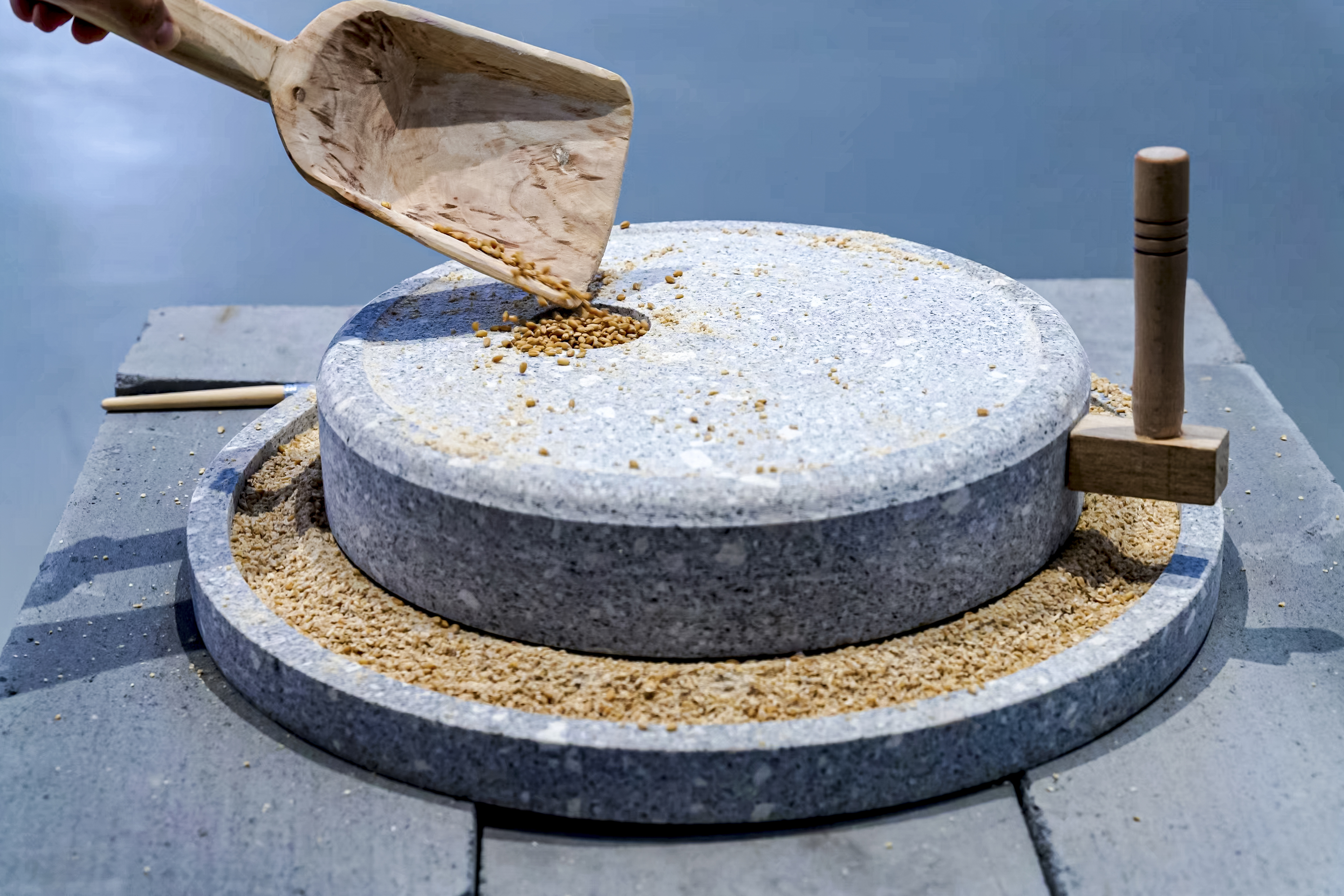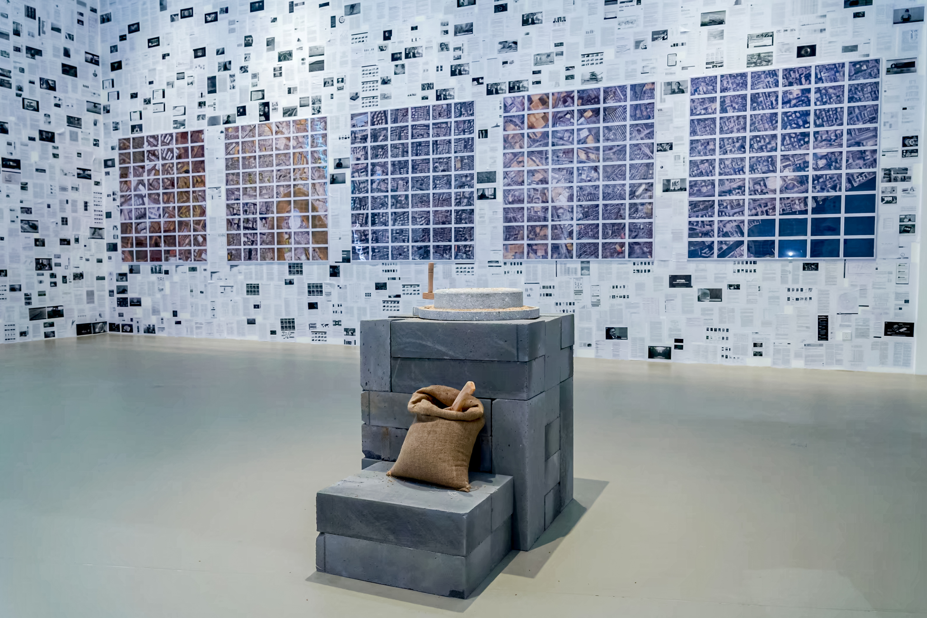 当我们在展厅中亲自以石磨进行劳作,当我们在铺天盖地的信息图像与AI算法生成的食物数据中穿梭,当我们面对食物与数据的等价衡量,当我们的味蕾、嗅觉和听力被经验唤起,都是赵与林正在以小麦和数据作为切口,将宏观不可见的系统变为具体可感的体验,以开放性的观察者视角呈现对人、食物、数据及系统之间关系的再思考:小麦和数据如何相互独立又彼此关联地塑造着我们当下的景观与生活?谁在驯化谁,谁在主导谁?价值体系的标准要如何衡量?人的感官如何在这个日渐虚拟化与数据化的世界中被塑造?以及,人该如何理解自身在社会系统中的位置?