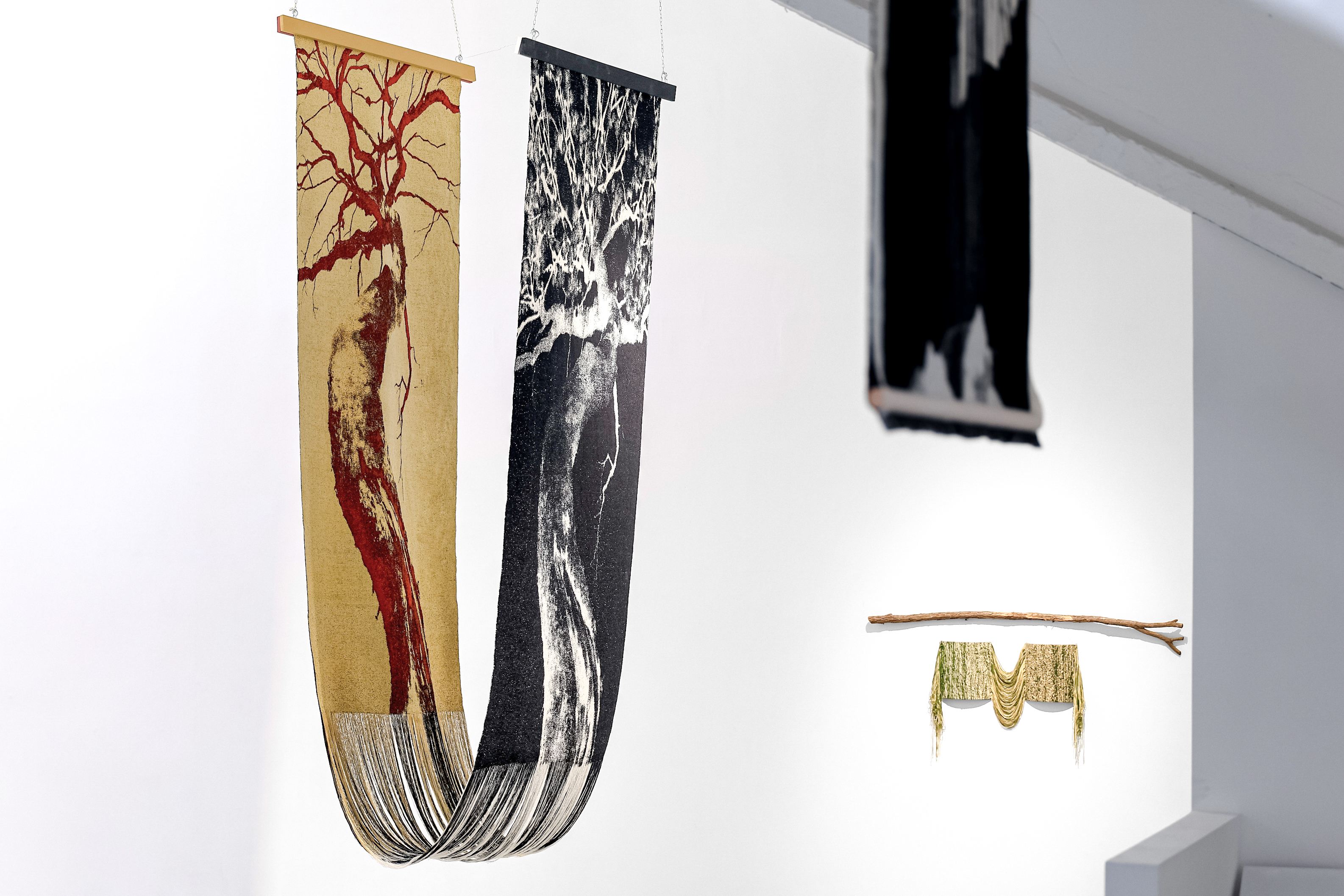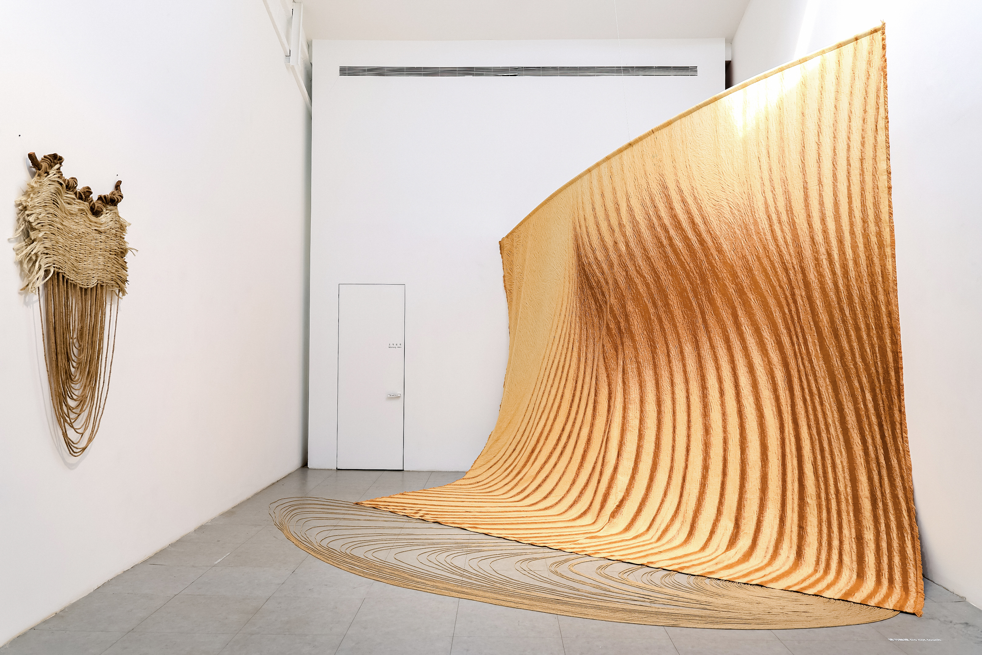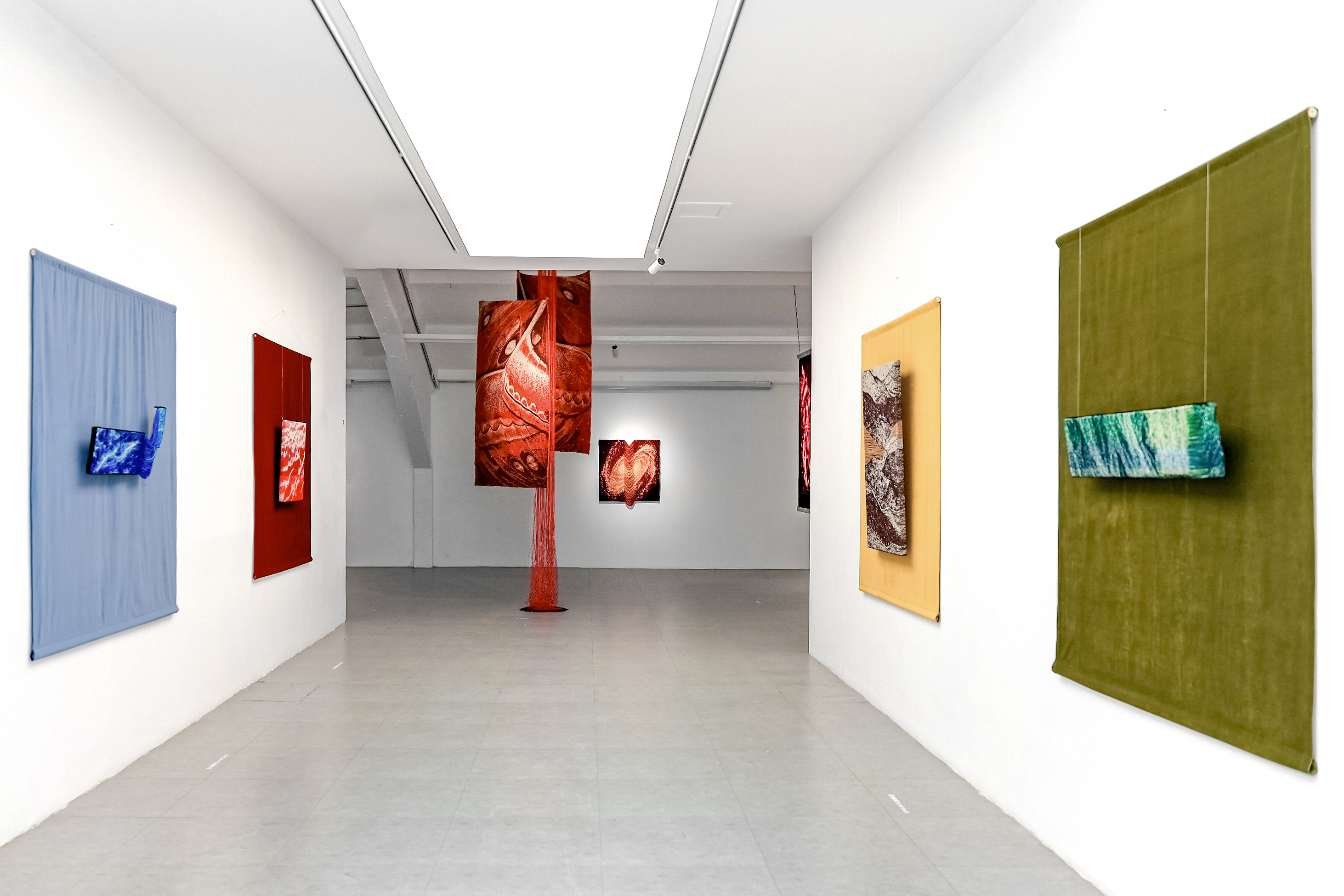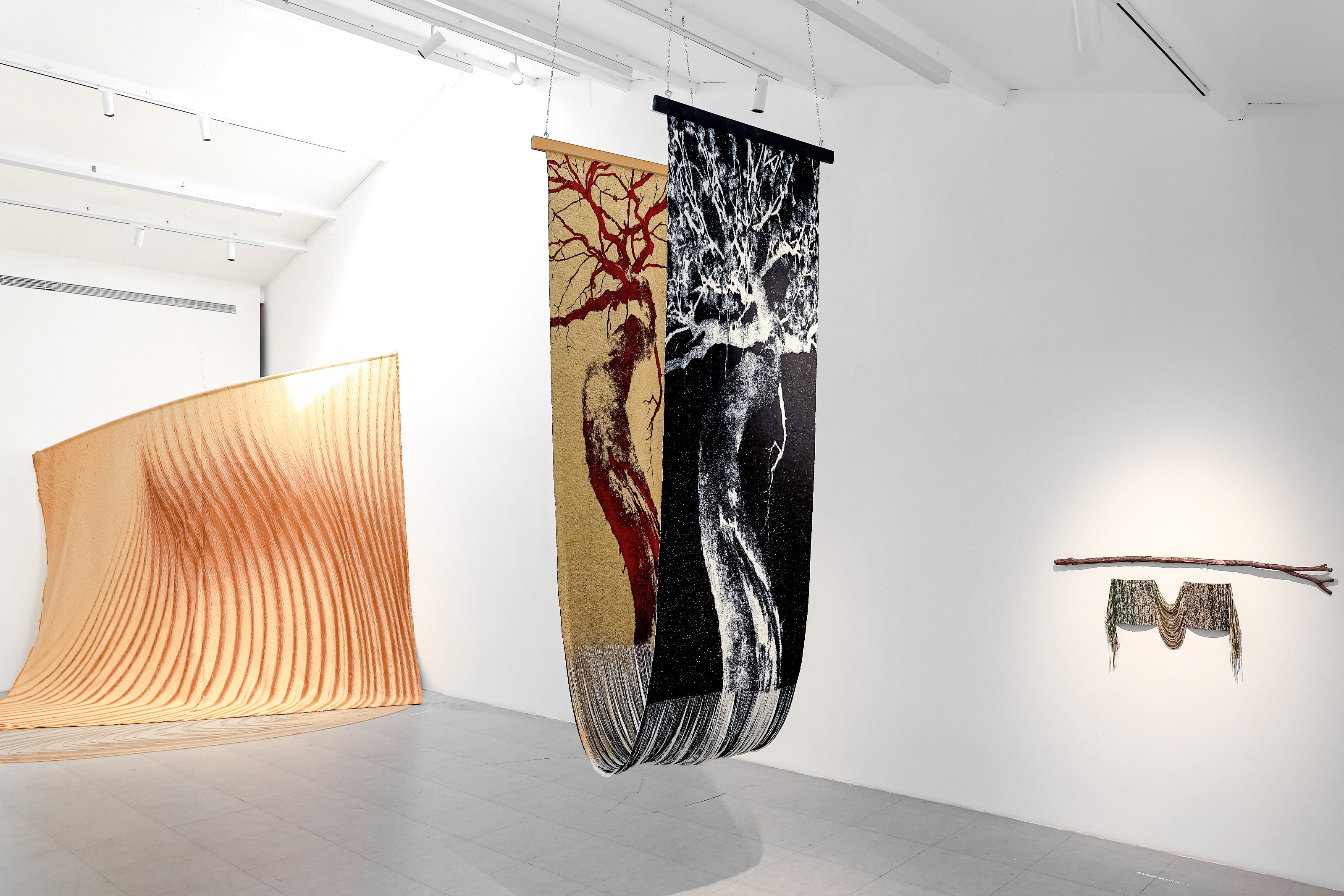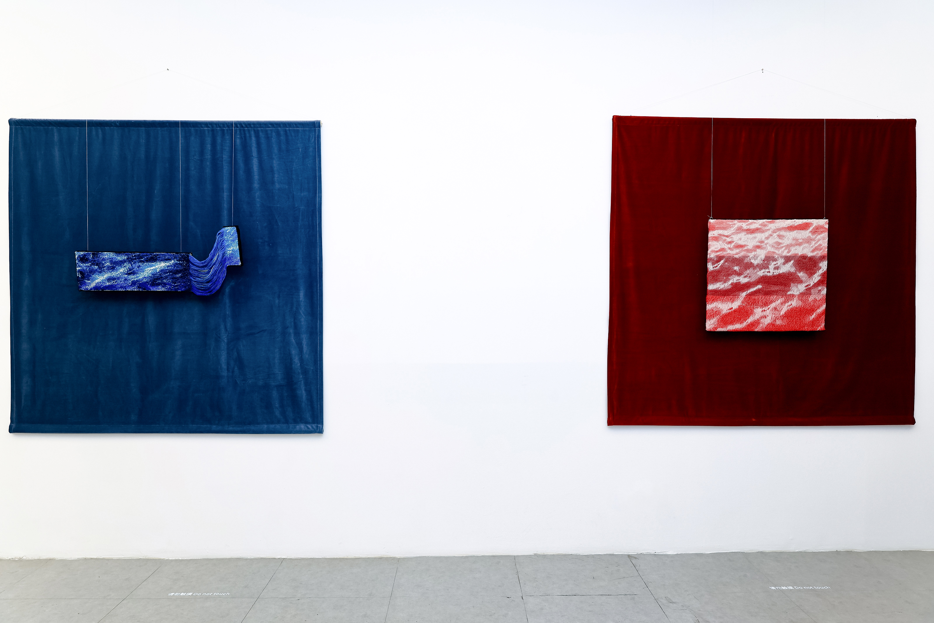 本次展览中,河久儿(He River)会为我们提供属于她的答案。成长在山水之城重庆的河久儿自幼便对自然元素尤为敏感,她认同“万物有灵”的观念,也受启发于加斯东·巴什拉(Gaston Bachelard)提出的“物质想象”(material imagination)与“空间诗学”(the poetics of space)概念,即自然元素不仅是客观存在的物质,也能够触发人类深层的想象与情感经验。正是在这一维度中,河久儿运用自身的的敏感,结合自然元素对个体感知的激发,以织物呈现其对于自然的想象。从不同阶段的生命状态出发,河久儿围绕“水”“火”“木”“土”四种自然元素展开创作,展览中,这四种元素会以跨物质的方式在空间中交织呈现。