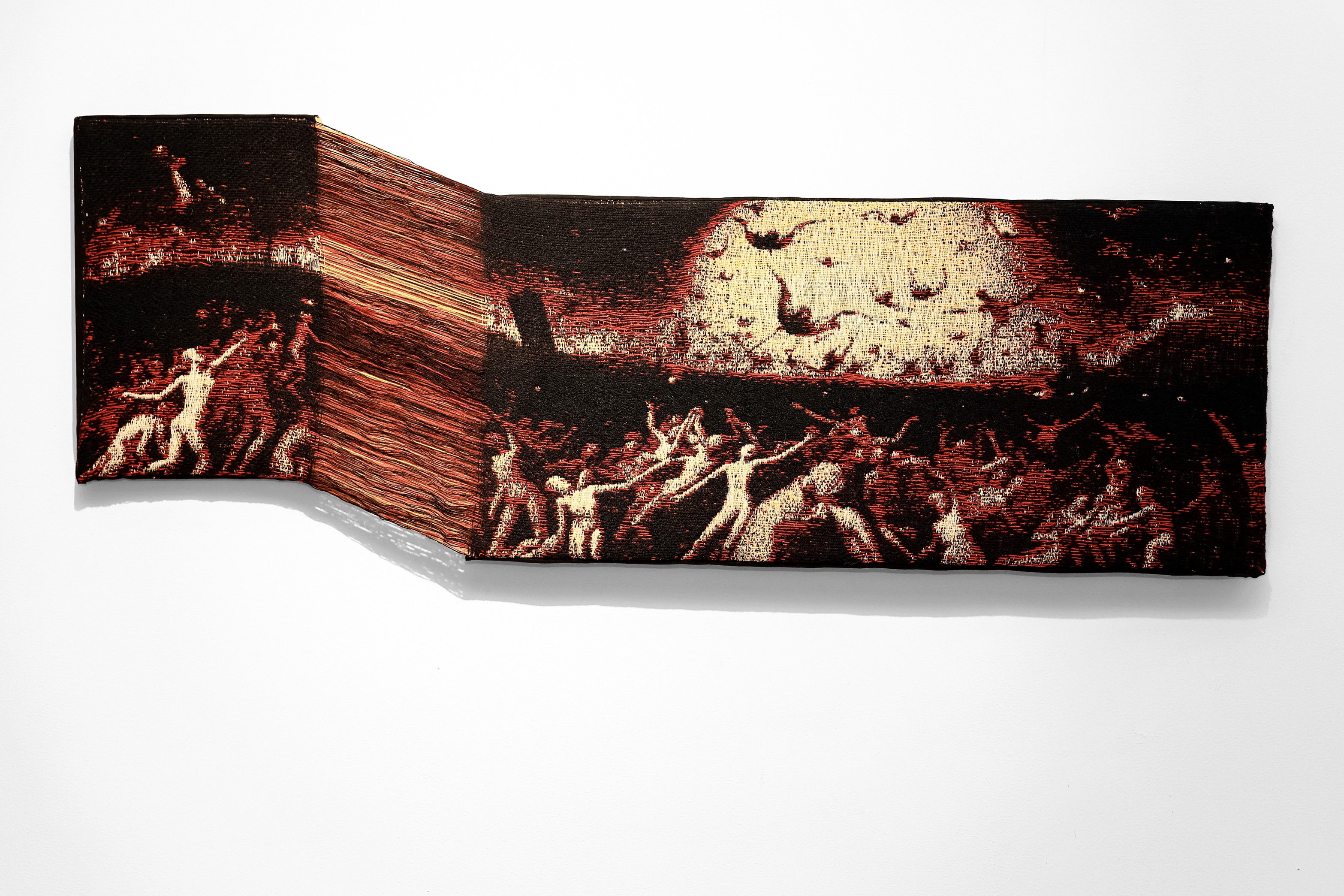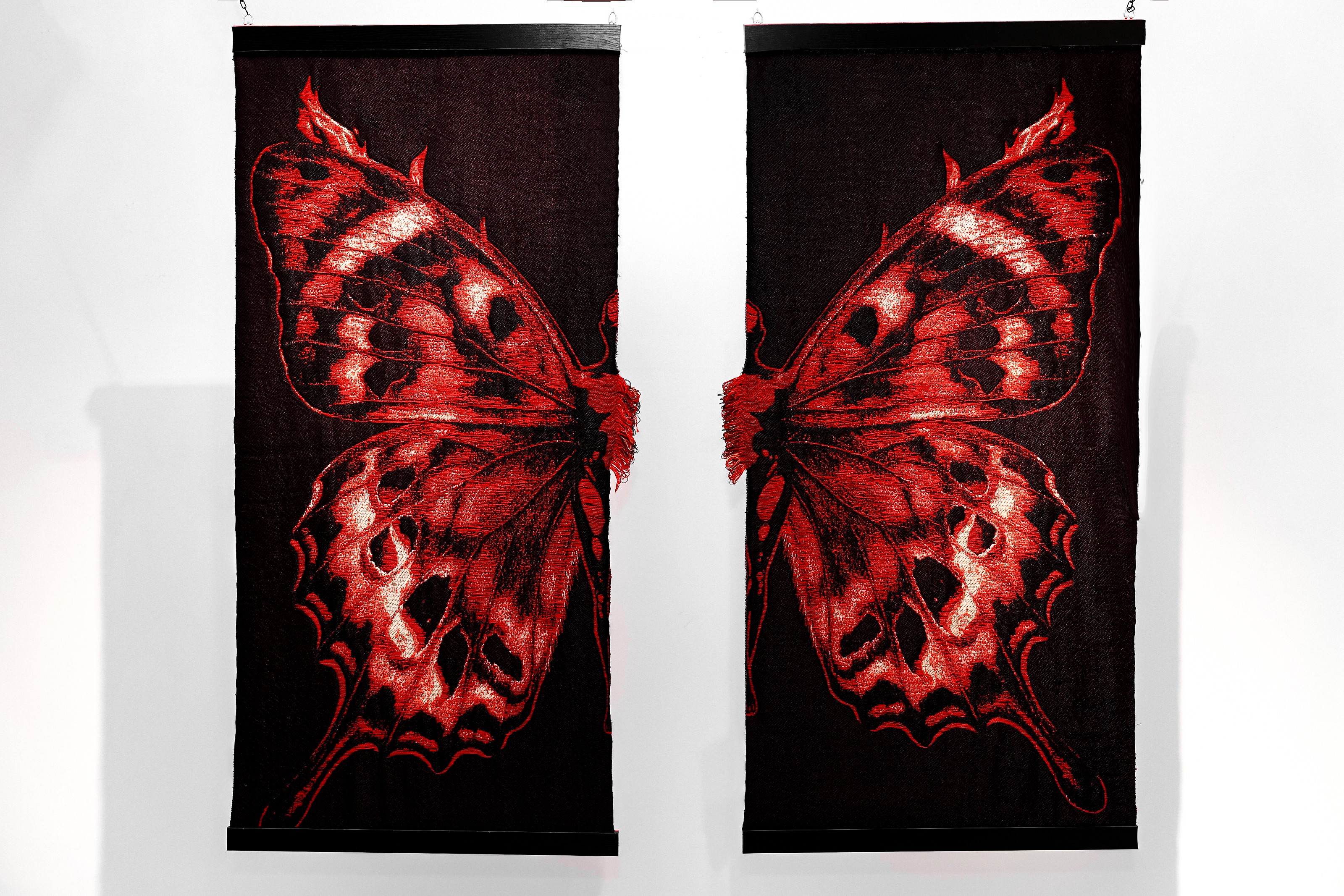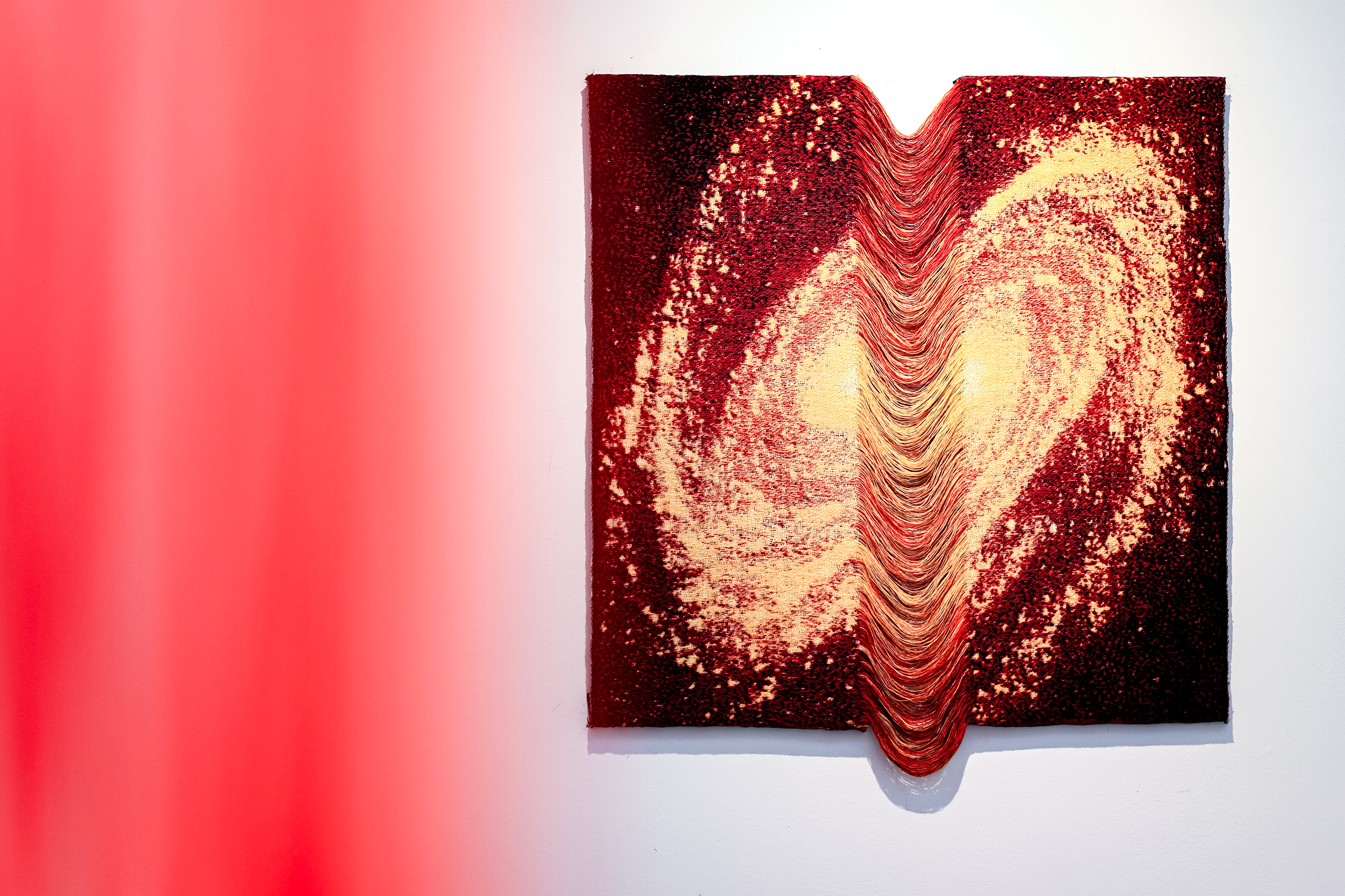 水是河久儿艺术旅程的起点,从幼时起,河久儿便被告知自己五行缺水,因此,水成为她意识与命运的重要承载。《坠落》系列以水为媒介,却不止于水的形象,艺术家用高反差的黑白双面编织结构呈现瀑布的坠落,这种向下的冲击不代表失重,而是意识的回响与重生的潜势;来到挪威求学生活的河久儿感受到了文化与语言的双重隔阂,于是在《我们的根》中,我们看到了她借由树的根系呈现出的关于交流的想象。作品由底部相连的两幅垂直悬挂织物构成,通过底部纤维的交织结构,模拟树木通过地下菌丝网络进行的信息交换,隐喻了一种人类之外的,超越语言的无声交流。从2025年开始,河久儿开始在土地中寻找自己的身份归属与精神来源,她把土视作一种身体亲缘,一种自带的文化“母色“。《皮肤》系列中,艺术家以手工编织的黄麻线、工厂提花与植物和工业纤维等材料进行大型综合创作,编织大地皮肤的走向。有时,垂落的线束像暴露出的土层纹理,有时,被托起的弧面仿佛一块被掀起的土地表皮,原生语境与后天记忆在织物的连接中相互缝合,由此,土成为身体的回归与深厚的包裹。如果说以上都是河久儿的向内追寻,那么以《灼涌》为代表的作品,便是她借由对火的感知想象,呈现出的能量外溢。在河久儿2026年的新作《灼涌》中,她以地质岩浆能量的灼热与内在器官血液涌动为同构,将红黑协奏的织物弯折成椭圆结构的“身体”。细密的红色织线如血管的网络一般从中央径直四散,金属纤维在其中闪烁光泽,如同隐藏在深处的热度。