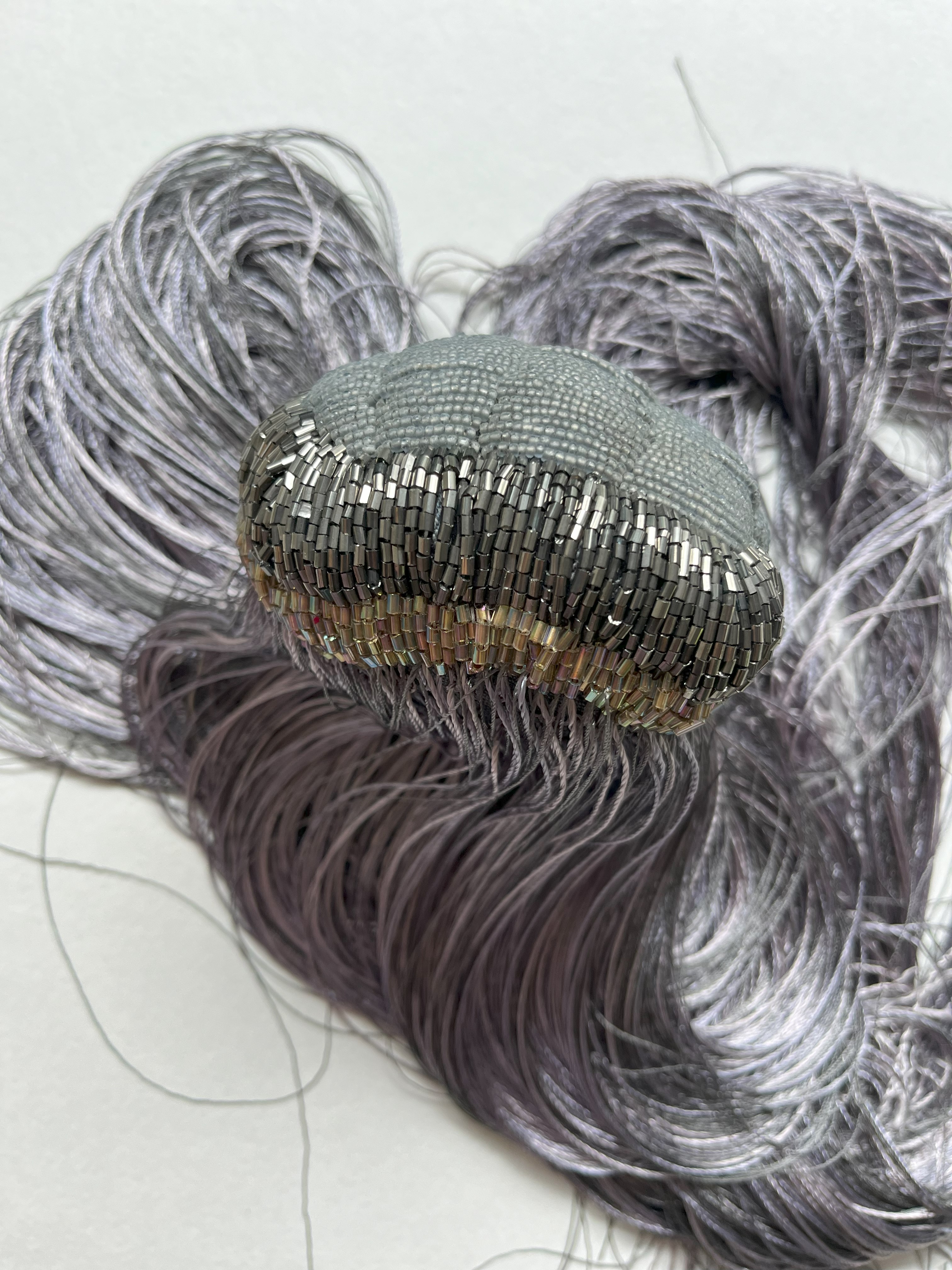 I create works without sketches, as I am interested in self-forming composition as part of the creation process; drawing develops as a living creature, taking new forms throughout the work. Individual elements like the beads, stitches, and lines construct my structures and form my visual language.
