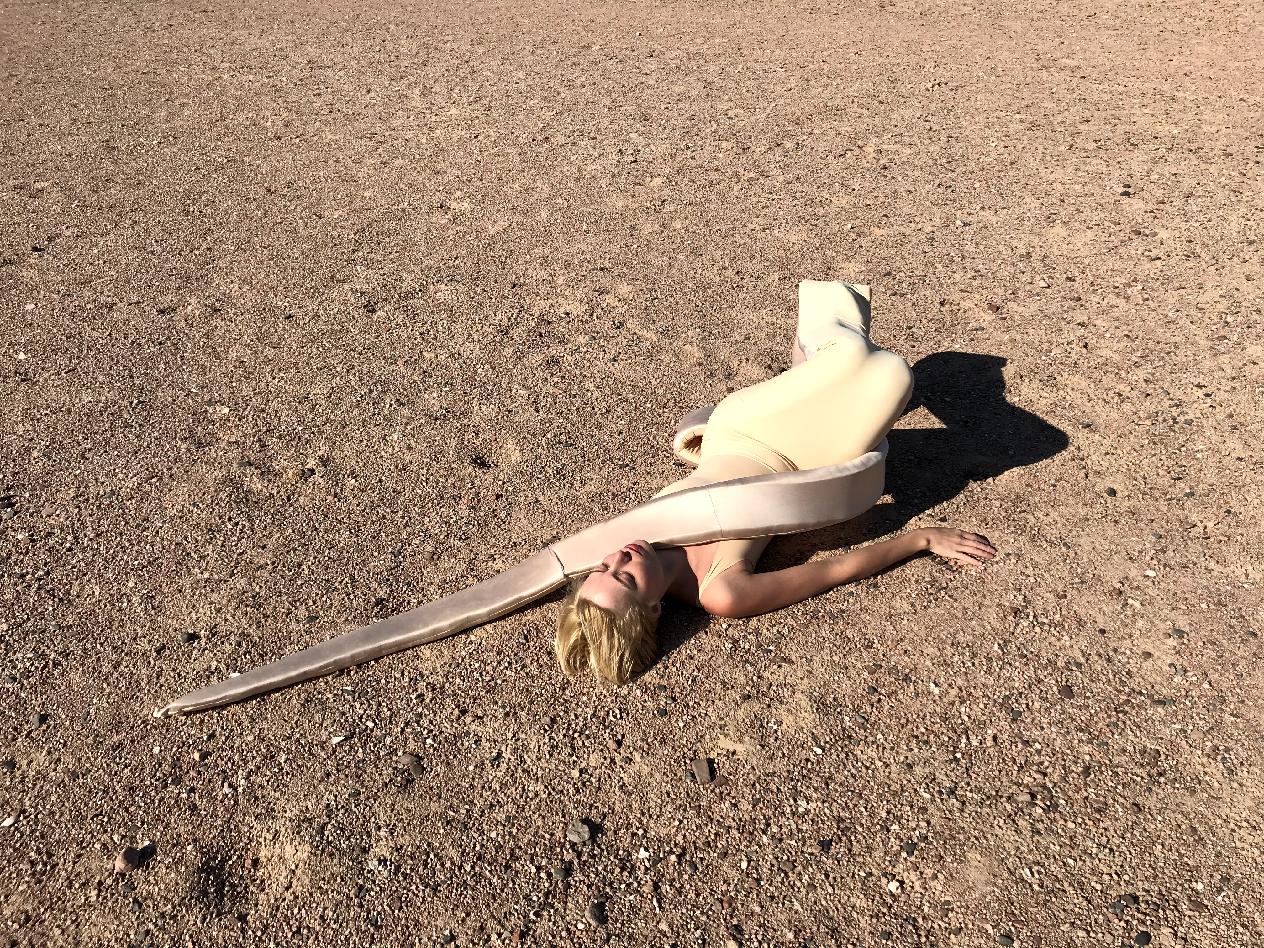 《蛇化》是一个视频艺术项目,诞生于2019年我与恐惧及一种逼近的变迁感的激烈对峙之中。以蛇作为深刻个人化且原初的恐惧的有力隐喻,我开启了一段探索之旅。我的目标是与我内心的恐惧合而为一,在身体与情感层面将其具身化,在蛇面前将自己彻底剥开——无论是字面意义上还是象征意义上——并拥抱它那无法逃避的本质,最终与它完全融合。为了促成这一切,我制作了一条三米长的尾巴,它成了我在达哈布沙漠中的同伴,我在那里试图捕捉这一蜕变的过程。