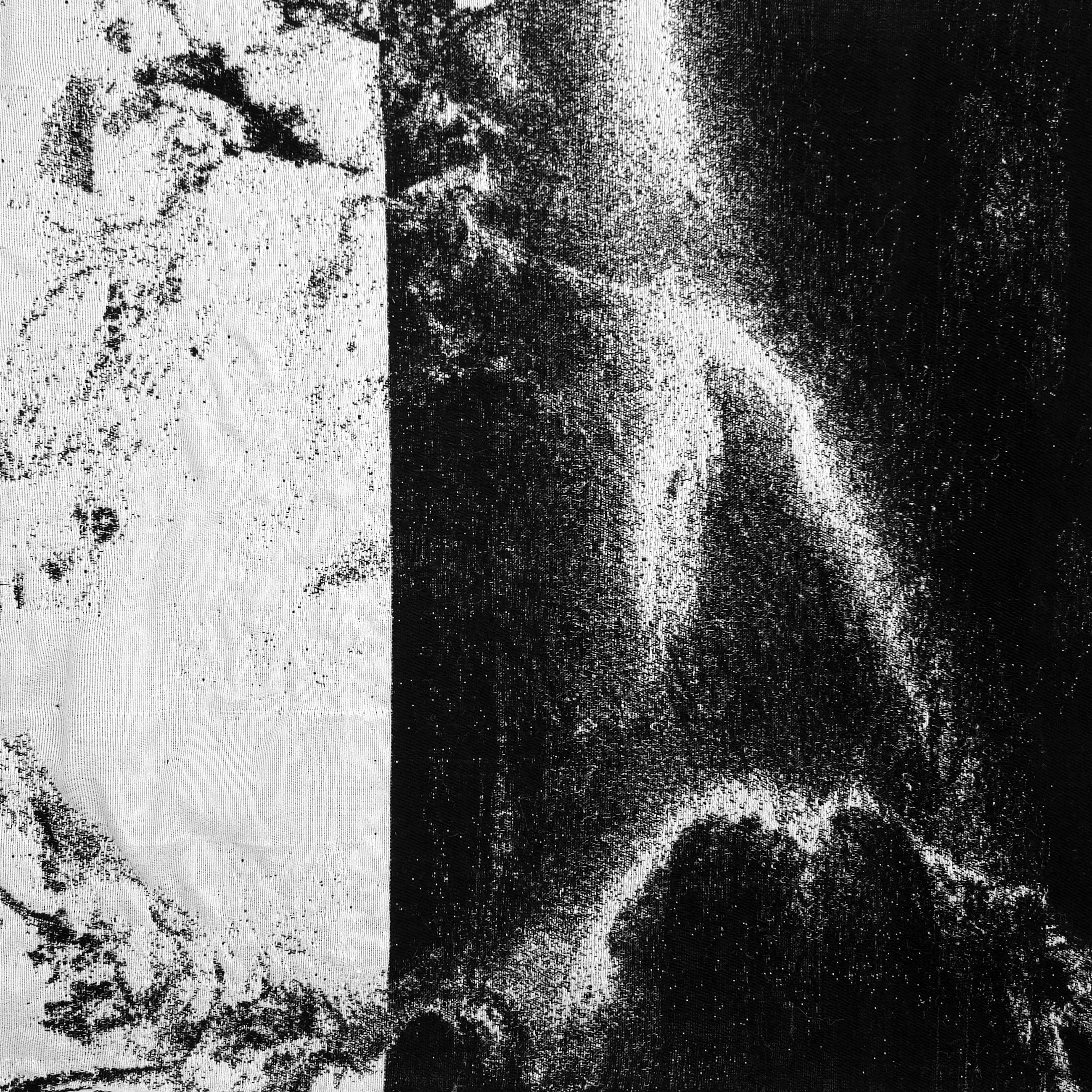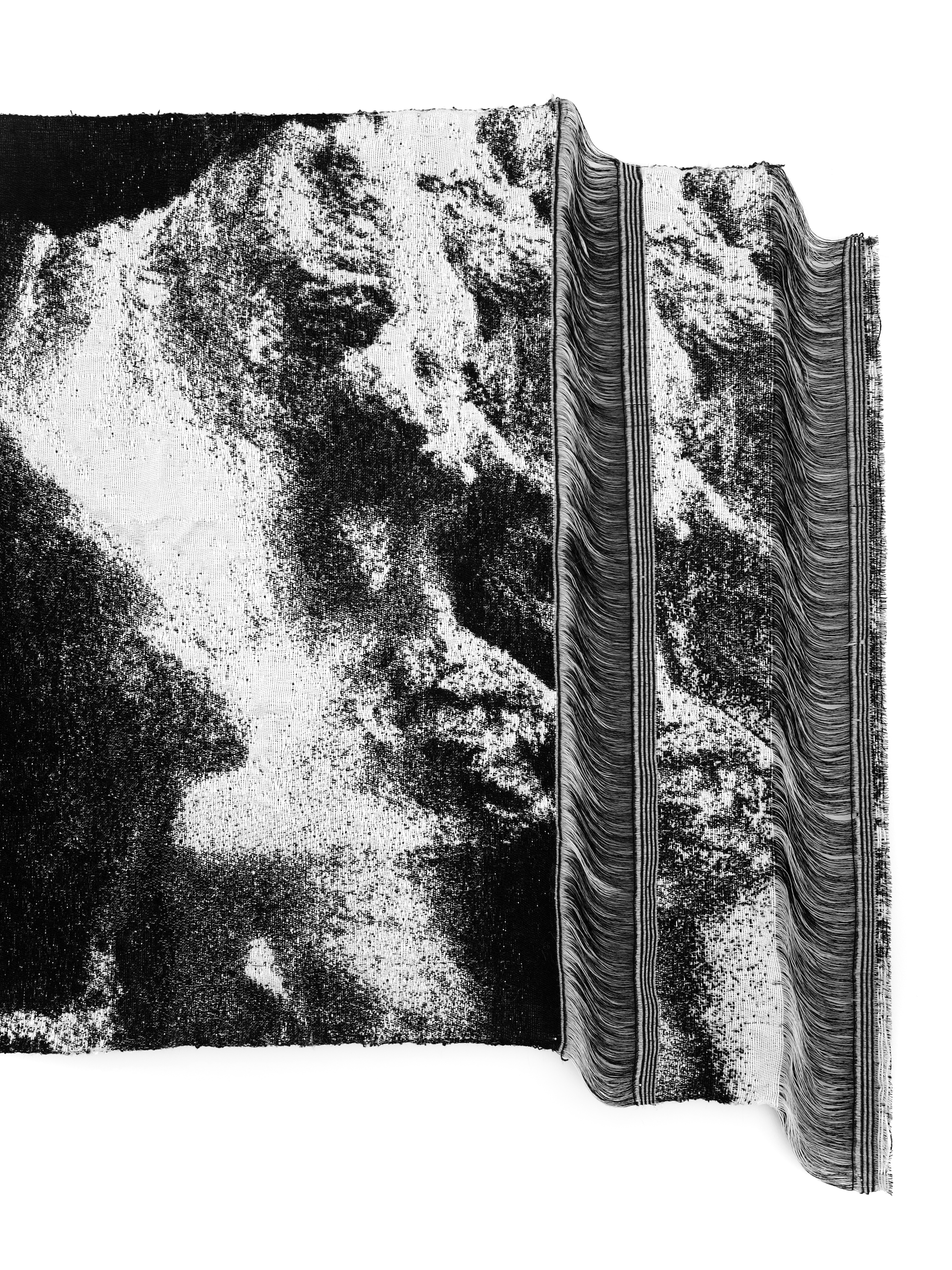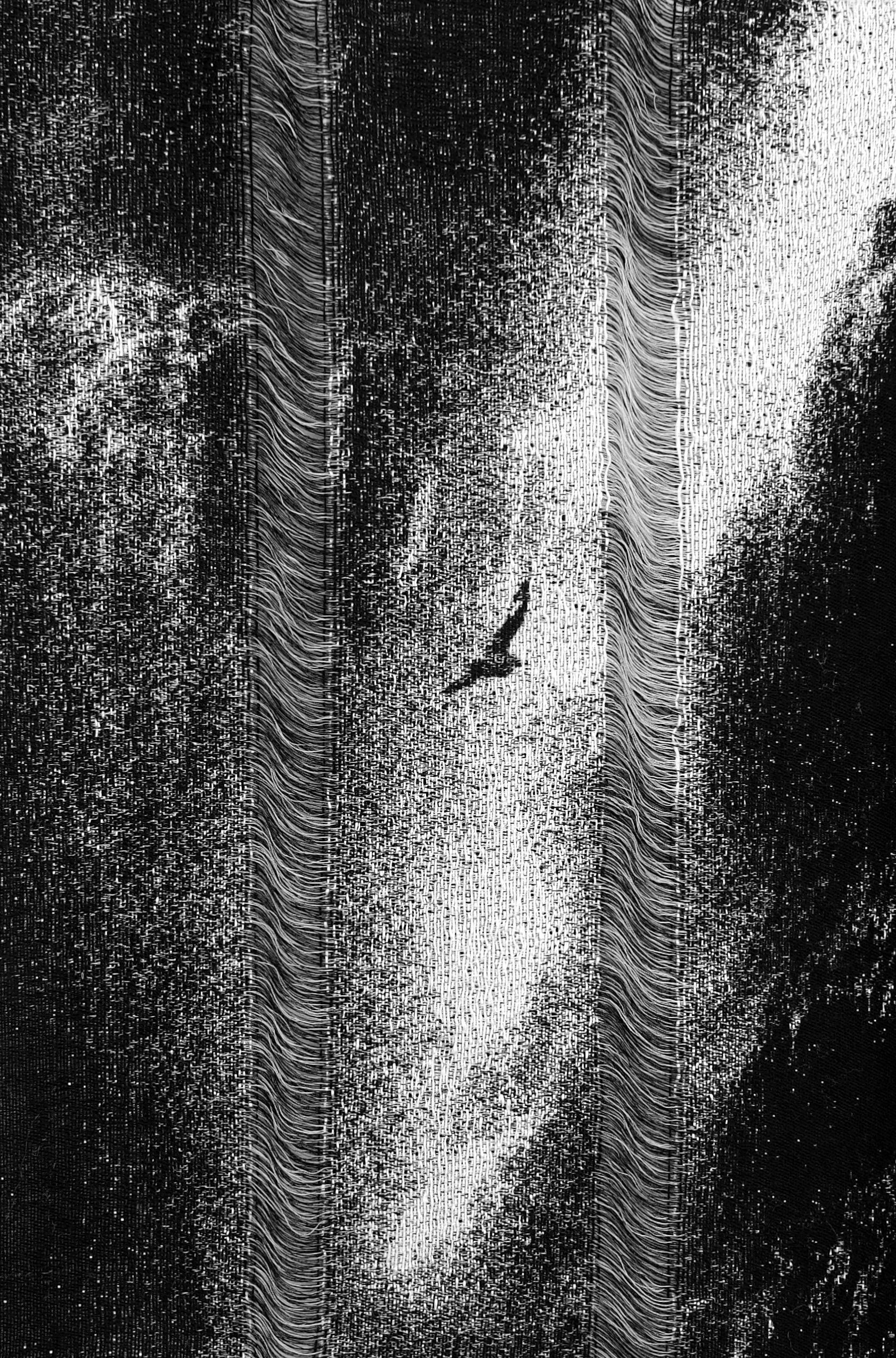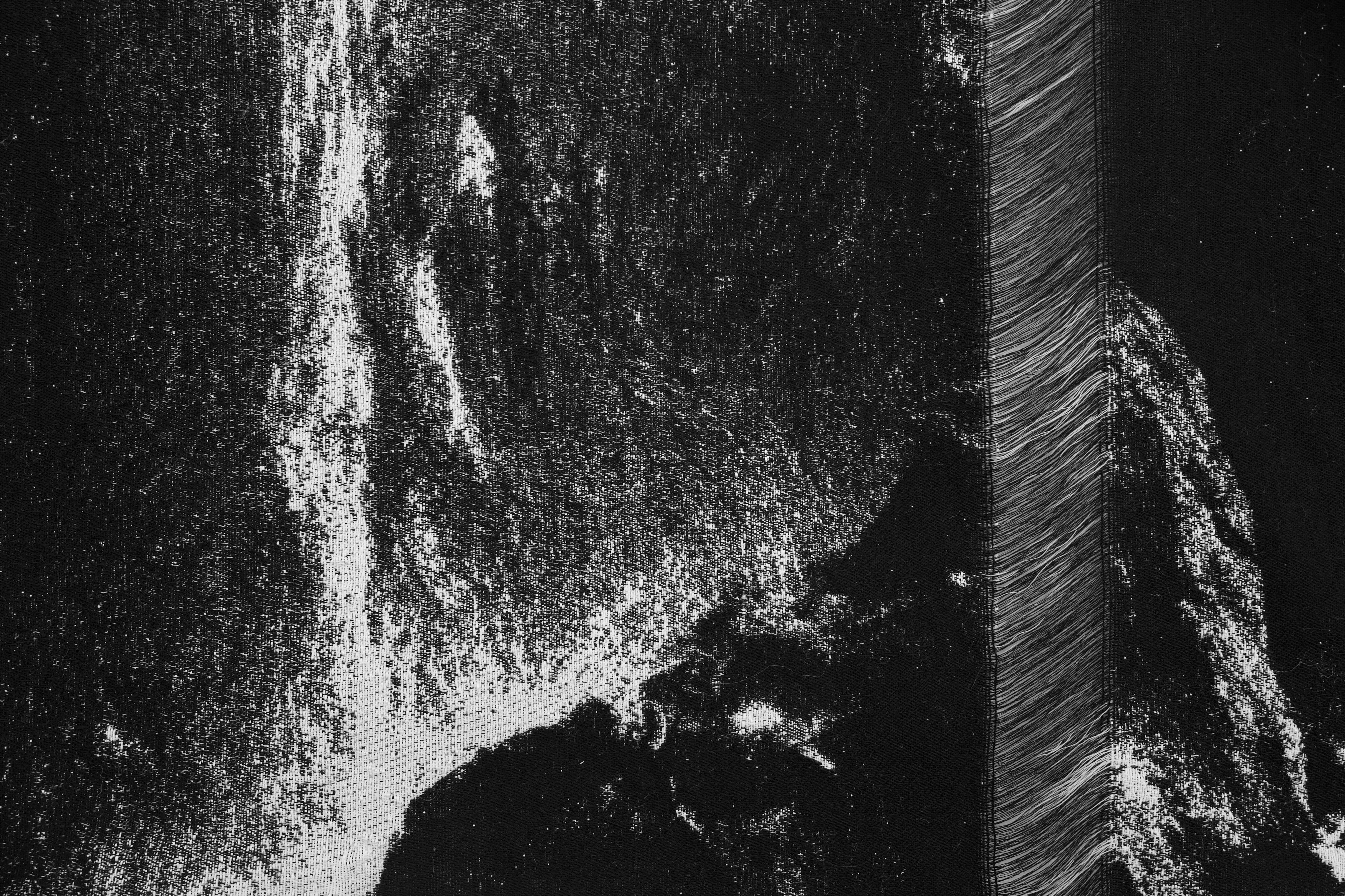 《坠落2》呈现了一副洞穴瀑布的全景图,织物之间断裂成流动的曲线,如同水面折射出的意识裂隙。艺术家通过数字手织的重复与中断,将水的流动性转译为视觉的节奏。黑色连续又断裂的线条象征水的“转化”与“流逝”,在柔软与侵蚀之间保持着微妙平衡。艺术家用仿佛水墨画的图像去体现“水”的阴阳属性——柔软但具穿透力,包容却持续侵蚀。它既呈现出崩塌的瞬间,也隐喻重生的潜势,成为身体与自然能量循环的象征。