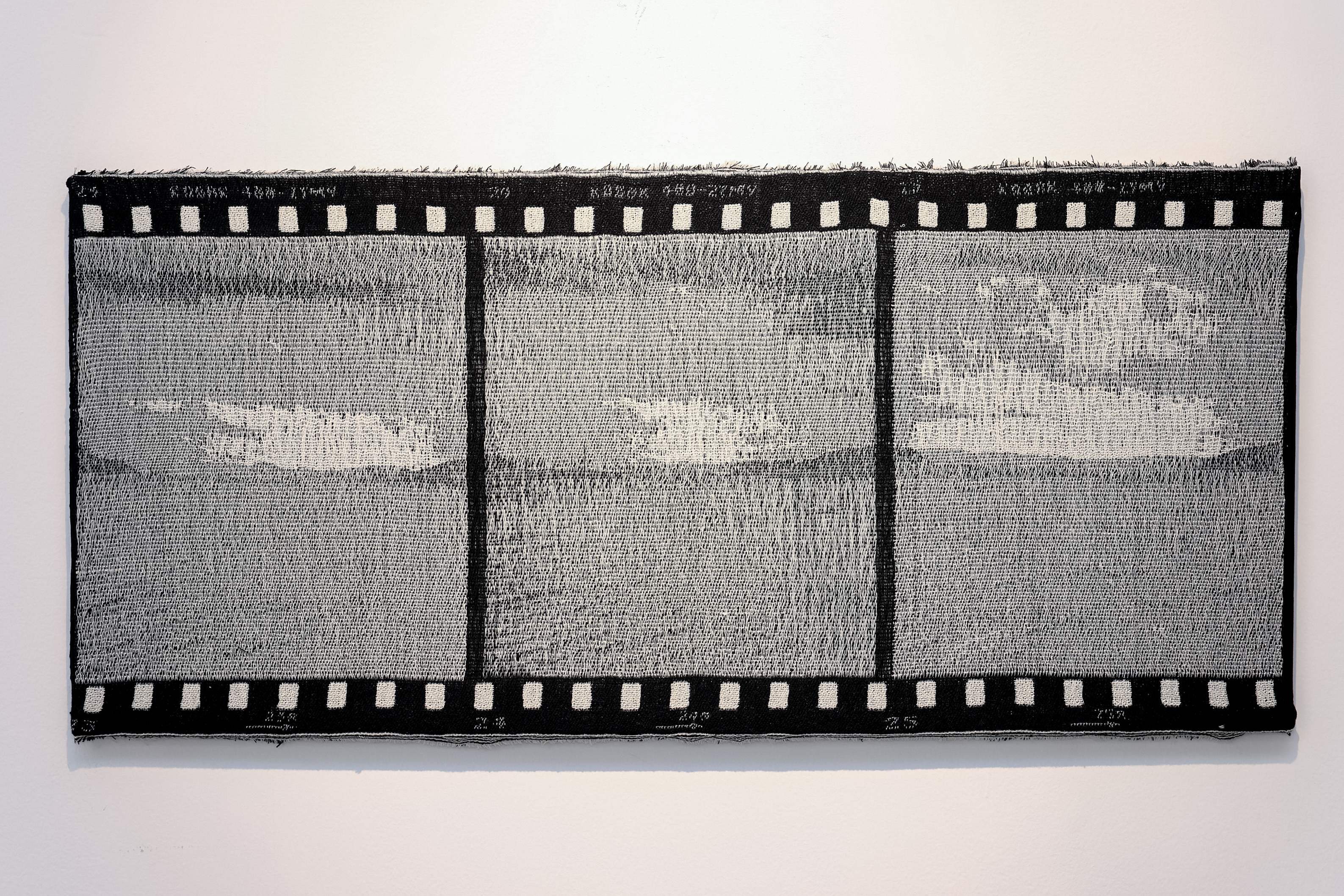 《北海》的图像源自艺术家初到挪威时拍摄的一卷黑白胶片海景。那一刻的北海平静而深邃,成为她对“水”理解的起点。作品以胶片的形式被重新织出,黑白的方格承载着光与时间在水中的显影过程——在显影液的浸泡中,水的化学力量让影像逐渐浮现。艺术家将这种“在水中成像”的经验转译为纤维的结构,使织物呈现成一幅黑白胶片。作品不只是风景的再现,更是对“水作为媒介”的反思——它让光、记忆与物质在缓慢的显影中汇合,成为存在被显现的过程本身。
